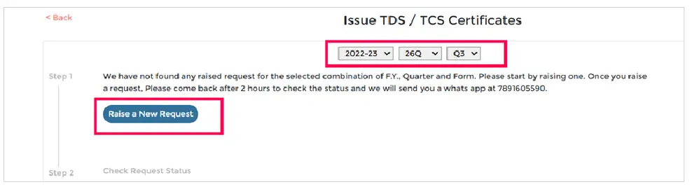 Step 2: Select the Financial year, Form Type and Quarter for which TDS/TCS certificates are to be issued and then click on Raise new request.