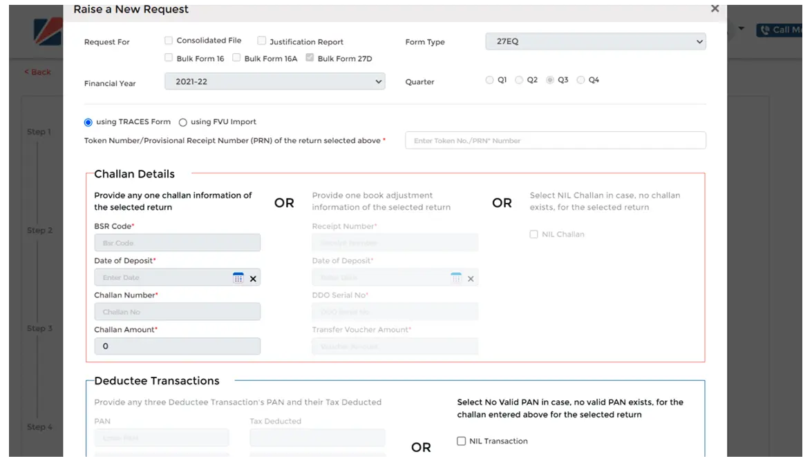 Step 3: Fill the Relevant details for placing the request and click on Proceed, alternatively the TXT file of the relevant quarter can also be imported to autofill these details.