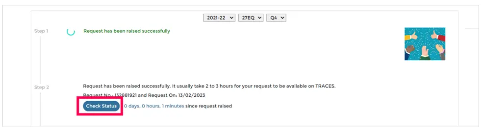 Step 4: Once the request is raised successfully, Kindly wait for the ZIP file to be available from TRACES. You can check the status of your request by clicking on the option as shown.
