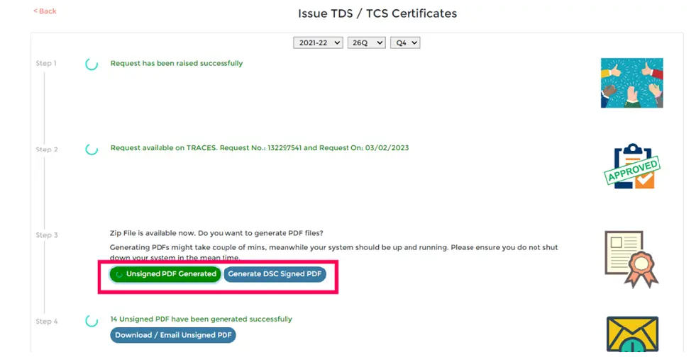Step 5: Once the Zip file is available you can click on "Generate Unsigned PDF" or "Generate DSC signed PDF" using the token.