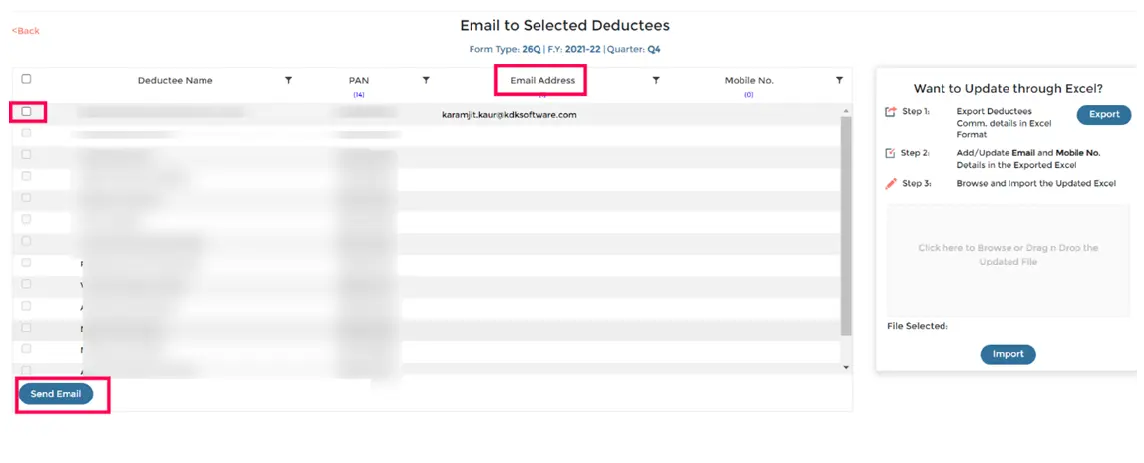You can update the email addresses of deductee in Bulk by using Excel export option.